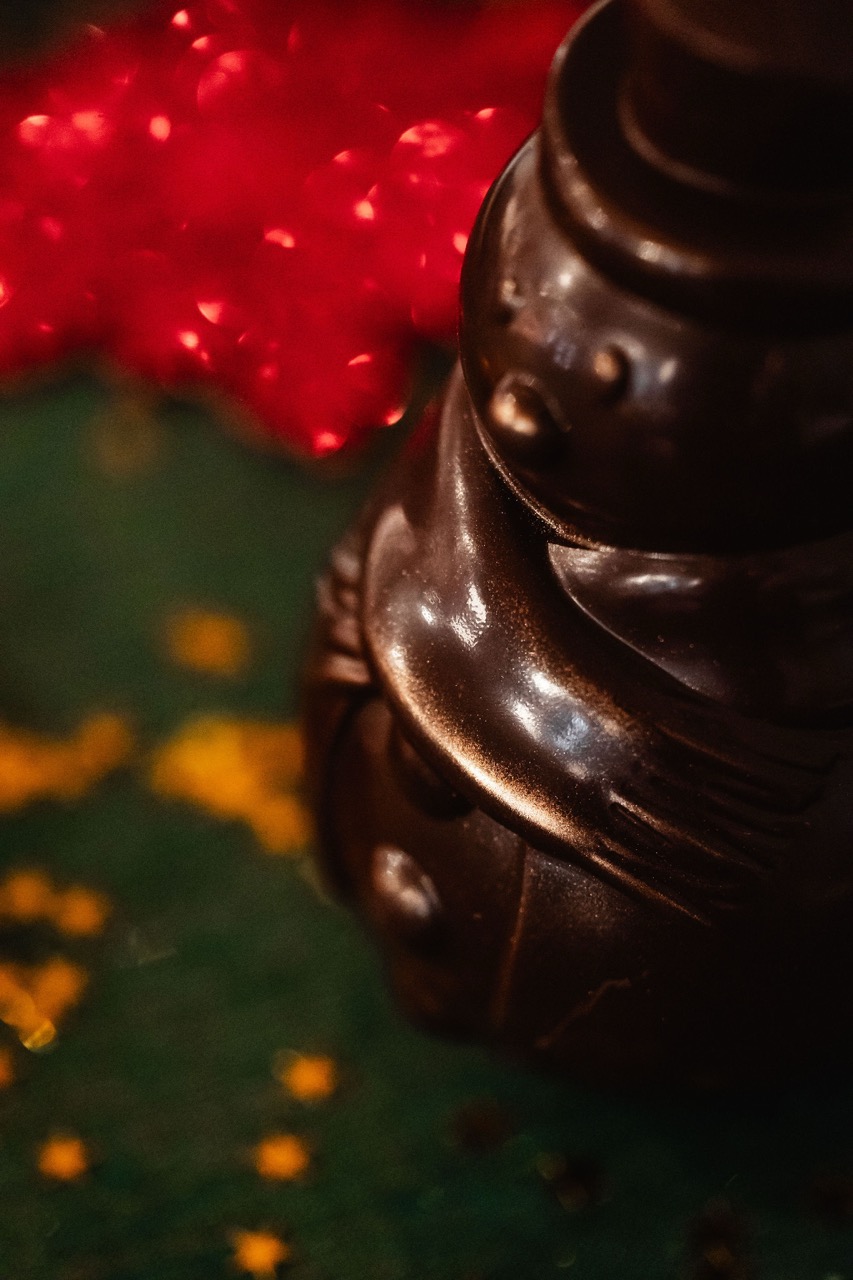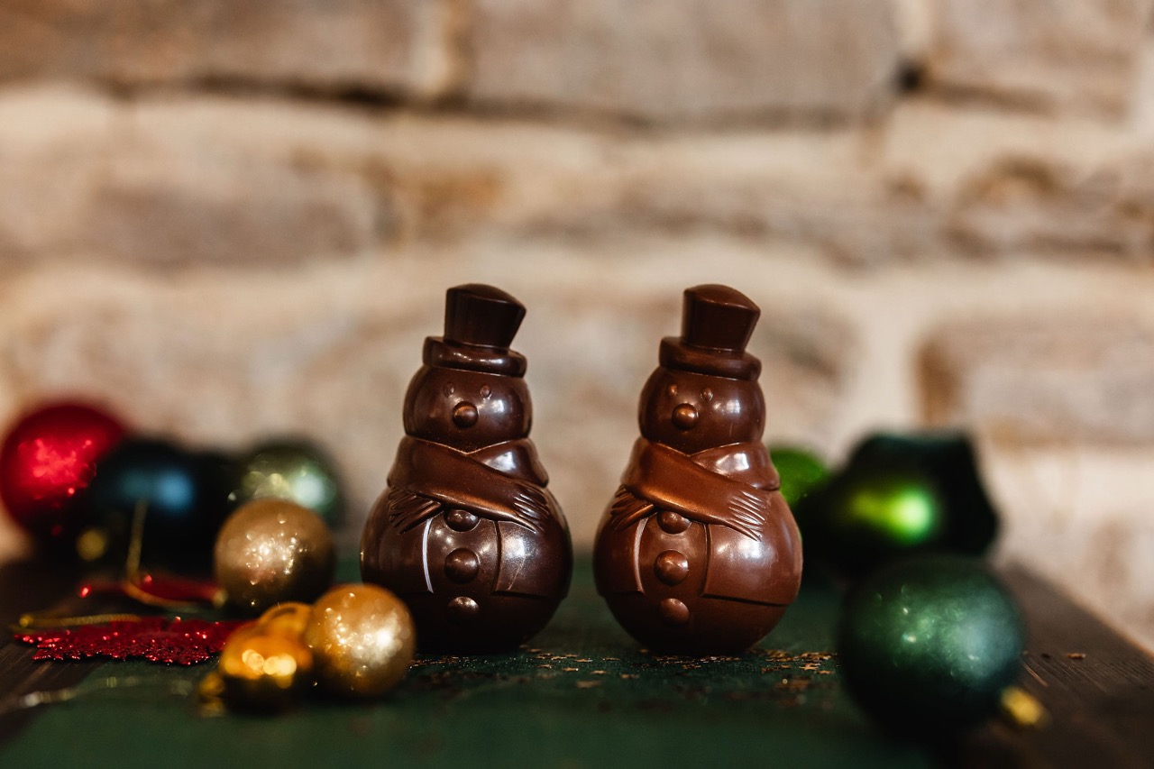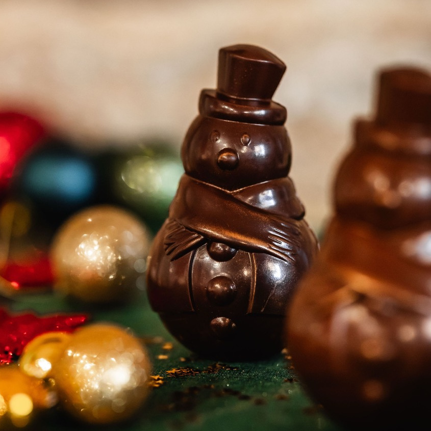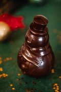 Moulage en chocolat noir 62%, garni de quelques fritures