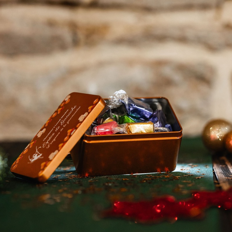Jolie boîte en métal garnis de caramels, nougats, pâtes de fruits (enrobés de chocolat lait ou noir)