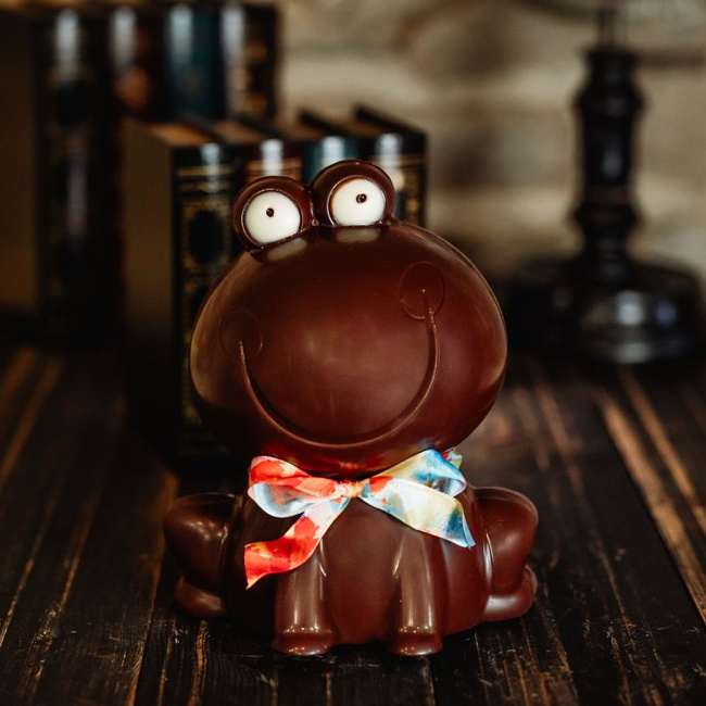 Moulage en chocolat noir garni d’un assortiment de fritures de Pâques, d’œufs praliné et de petits œufs