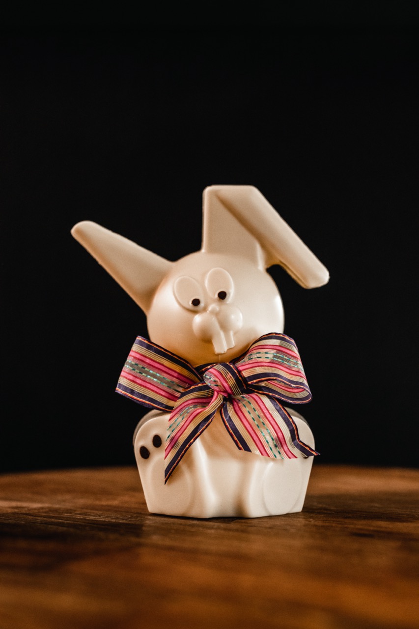 Moulage en chocolat blanc garni d’un assortiment de fritures de Pâques, d’œufs praliné et de petits œufs en sucre