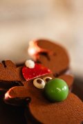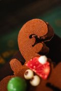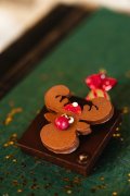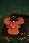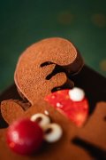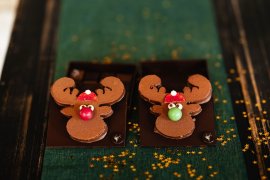 Notre renne en praliné repose sur un coffret en chocolat noir garni de ganaches et pralinés