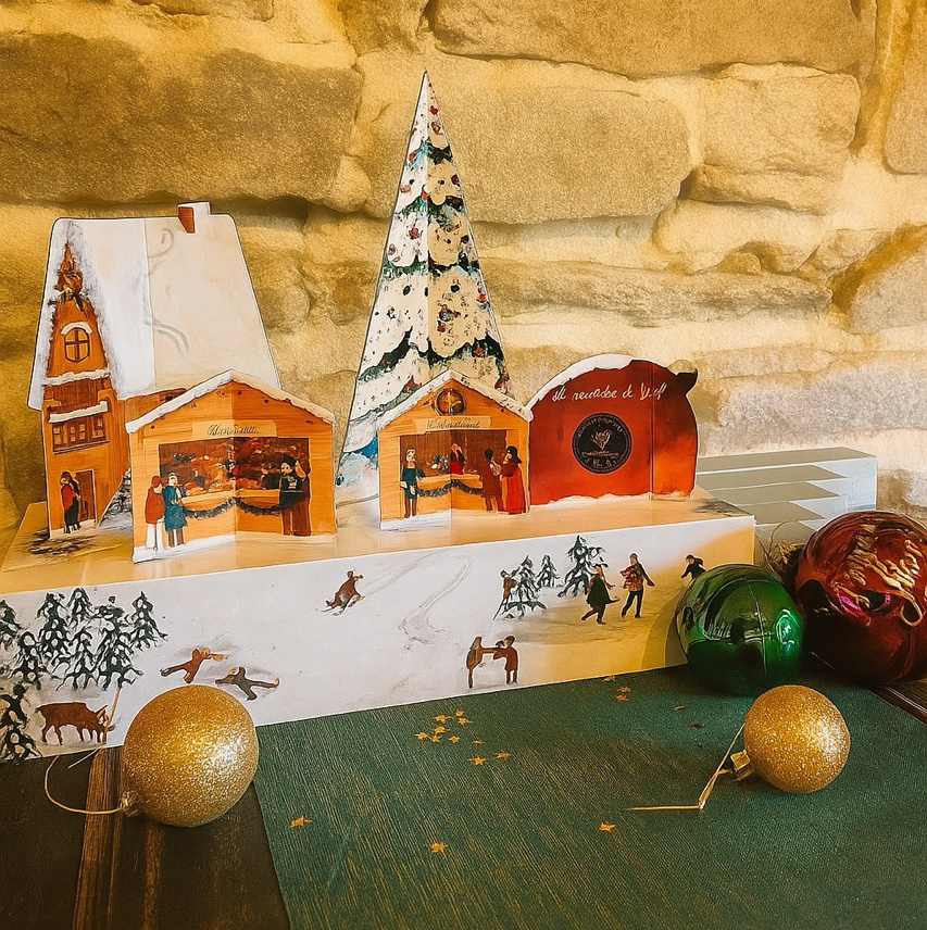 Calendrier de l’Avent garni de nos pralinés, ganaches, rochers, caramel au beurre salé, mendiants, pâtes de fruits et fritures de Noël.