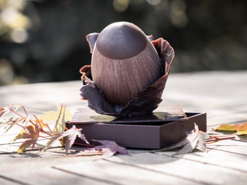 Une noisette en chocolat posée sur des feuilles et un coffret garni de nos ganaches et pralinés
