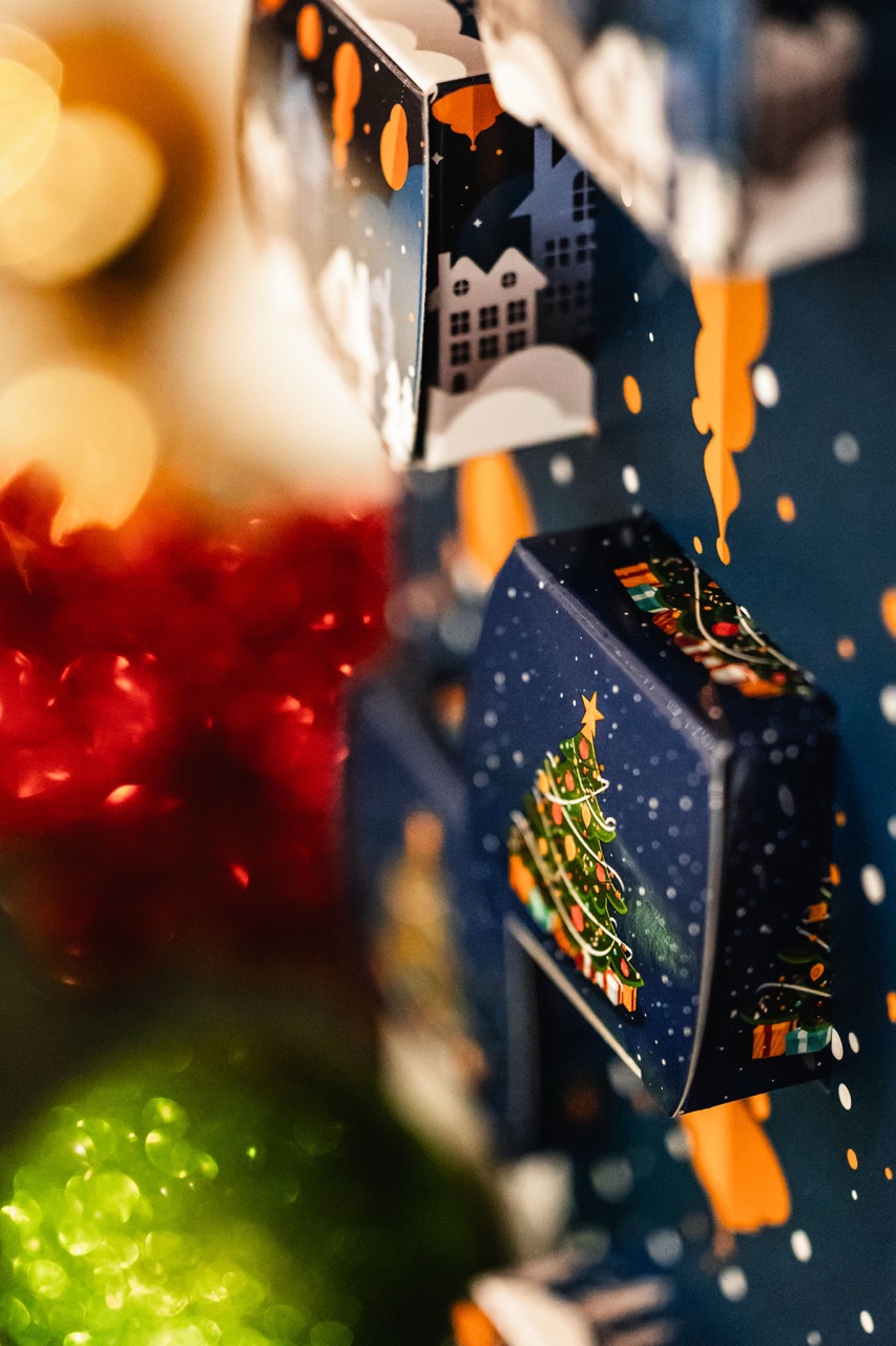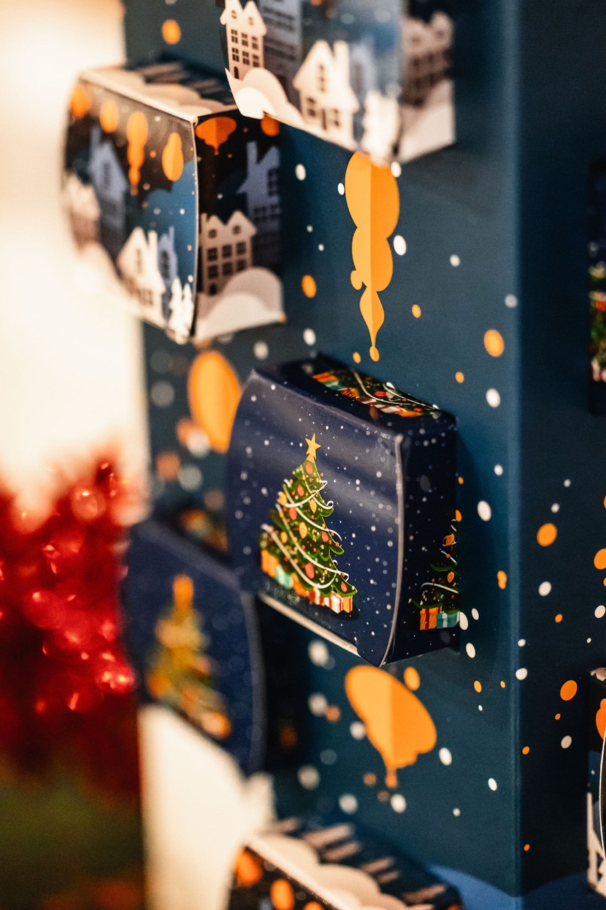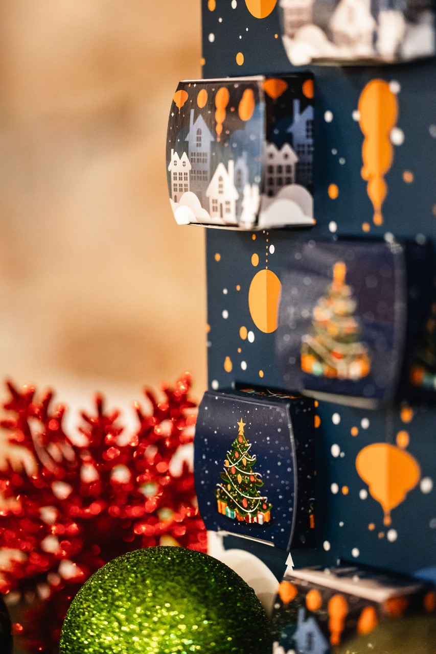 Calendrier de l’Avent garni de nos pralinés, rochers, mendiants, fritures de Noël, enrobés de chocolat : caramels, pâtes de fruits, nougats et guimauves.